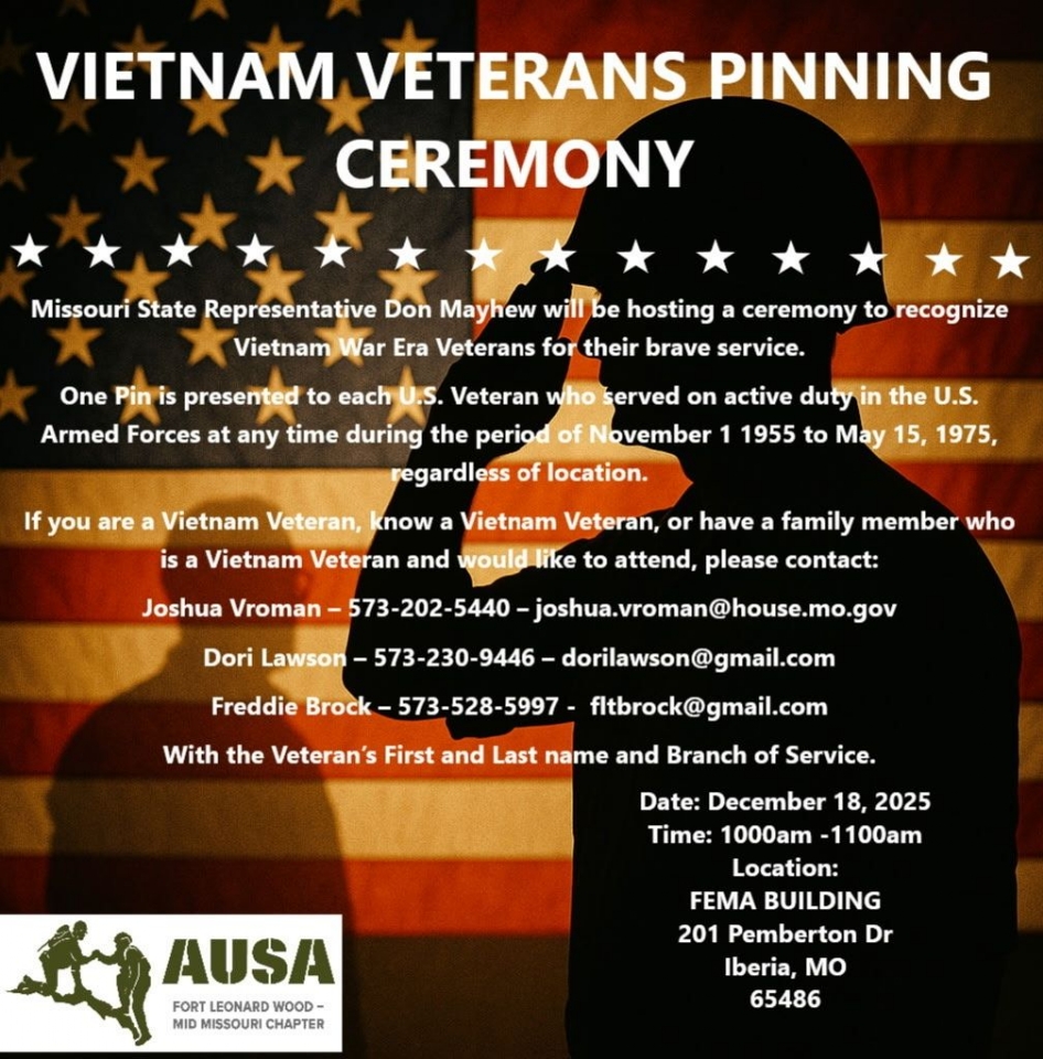 Please find a digital copy of the Boonville Daily News Veteran's Pride for Cooper County. A few of our members are in the guide. I have a few printed and bound copies if folks want them for around $1.50 each (one dollar and fifty cents). Let me know and I can bring them to the meeting. They are printed very nicely - like a magazine. ________________________________________________________________________________________ 05 Dec - Poker Night 13 Dec - Wreath Laying at Jacksonville Cemetery 17 Dec - Food Bank Feed America @ Columbia Mall 17 Dec - Legion Post Christmas Party - NO MEETING 20 Dec - Pancake Breakfast